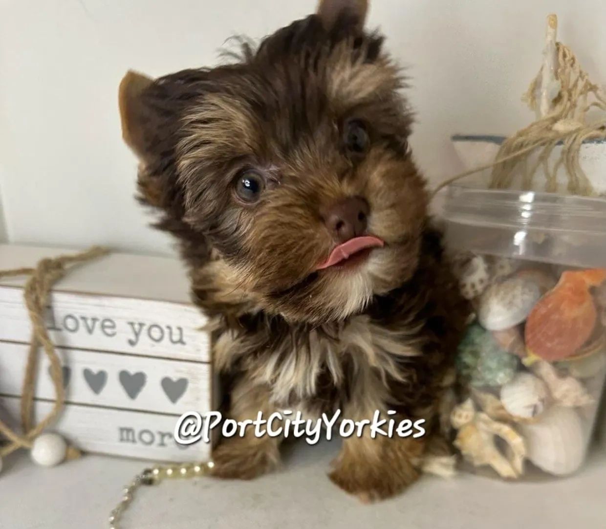 Meet Zoey, our charming chocolate & tan Yorkshire Terrier charting 6-pounds fully grown. Her coat is a rich, velvety brown, reminiscent of the finest chocolate, and shines with a glossy sheen that catches the light with every graceful movement. This delightful Yorkshire Terrier is the epitome of elegance and affection, with a dainty, yet sturdy frame that perfectly complements her spirited personality.